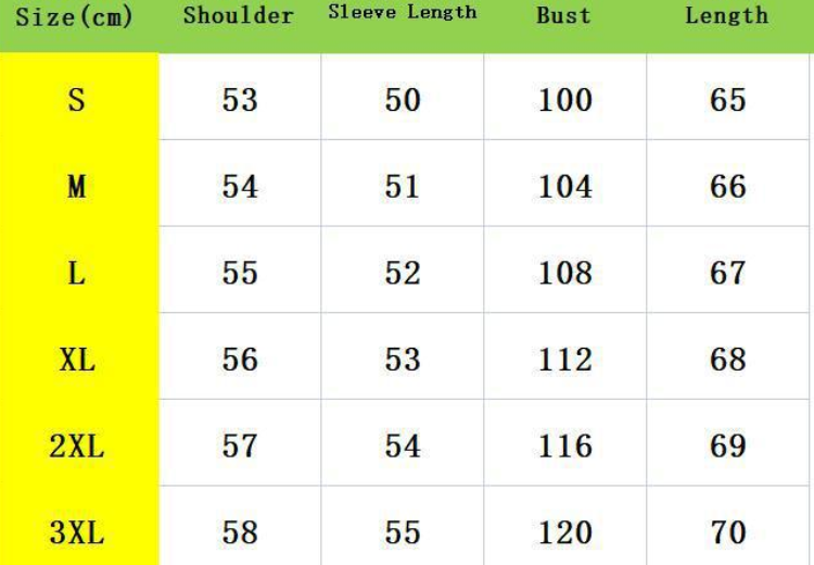 Size:S,M,L,XL,2XL,3XL unit:cm
