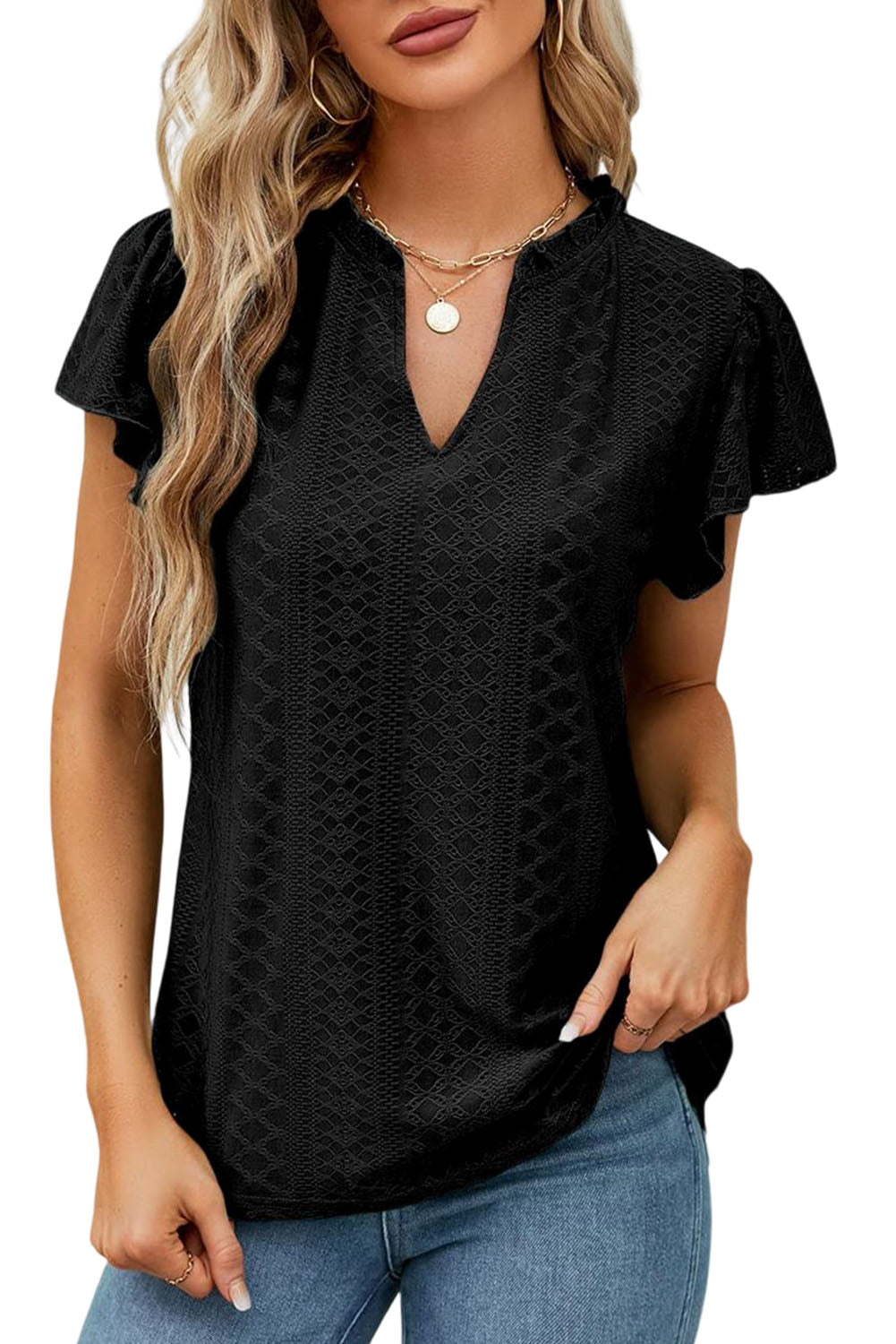 - It features a V-neck, delicate flutter sleeves, and a shift fit