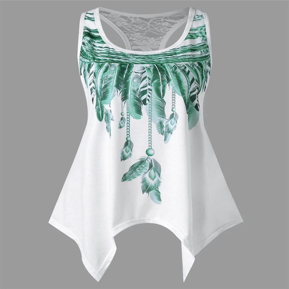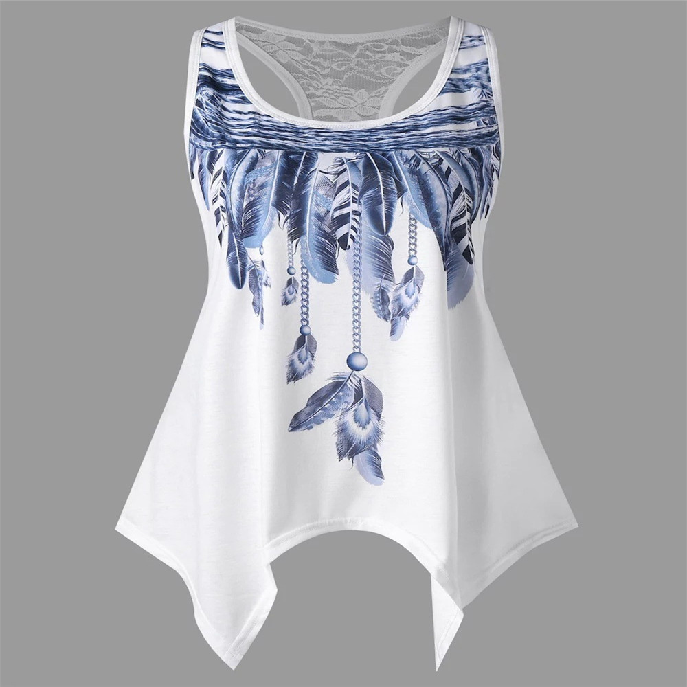 Feather Print Lace T-Shirt Summer Crew Neck Sleeveless Top