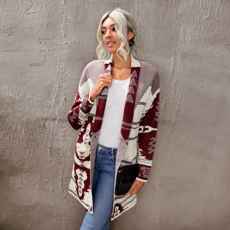 Long Printed Button Cashmere Knitted Cardigan Top Women