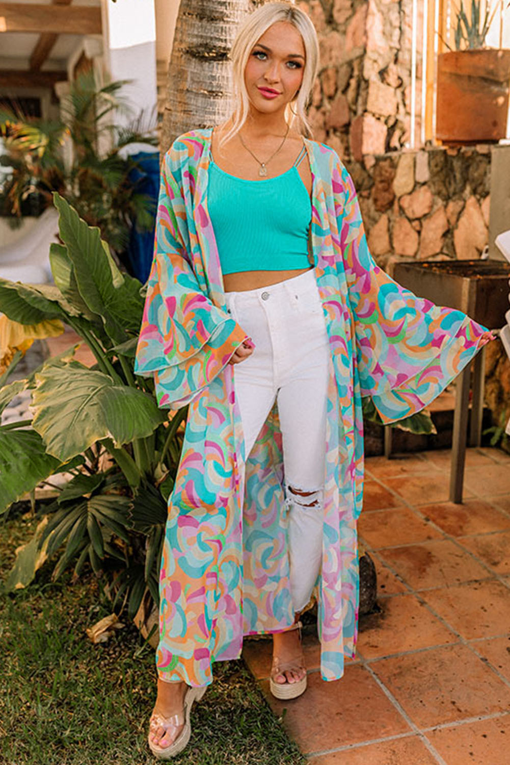Multicolor Printed Double Layered Bell Sleeve Long Flowy Cardigan