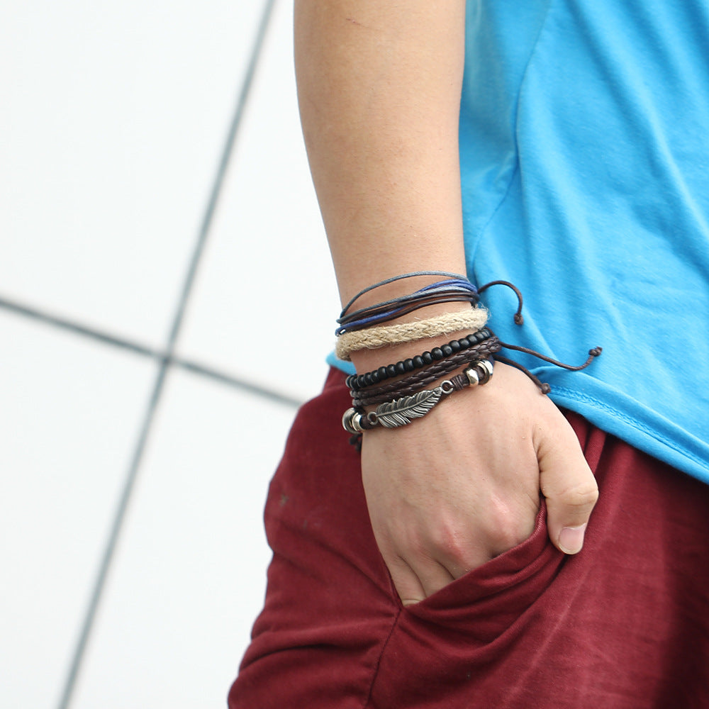 New Angel Wing Feather Alloy Multilayer Wood Bead Weaving Beaded Wax Rope Bracelet Star with Bracelet Jewelry