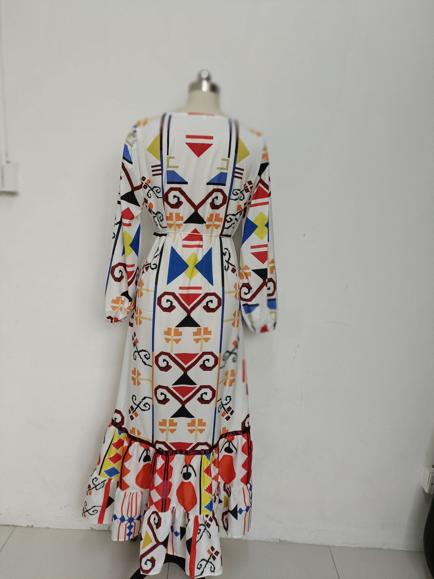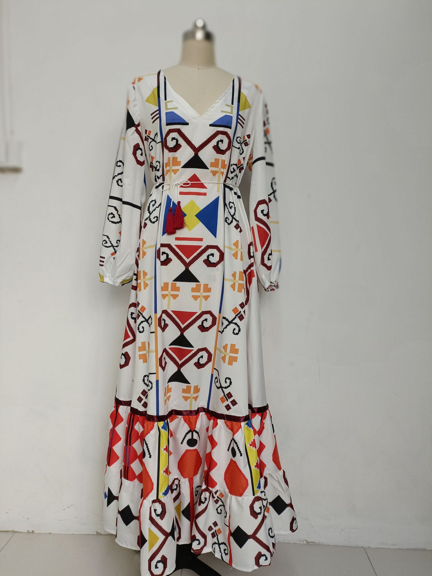 Women's V-Neck Long Sleeve Printed Boho Dress